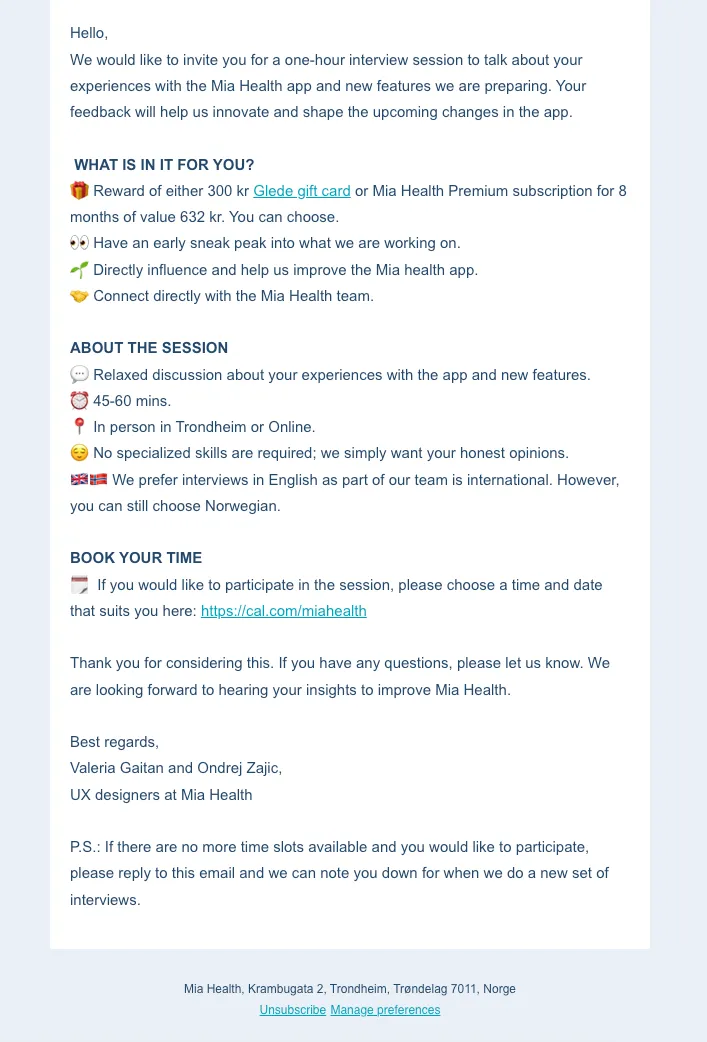 A consent form during onboarding meant users had already agreed to be contacted, giving us a direct email channel for interview invitations. Later I found out that it's optimal to contact around 100 users at a time, which yielded on average around 8 interviews.