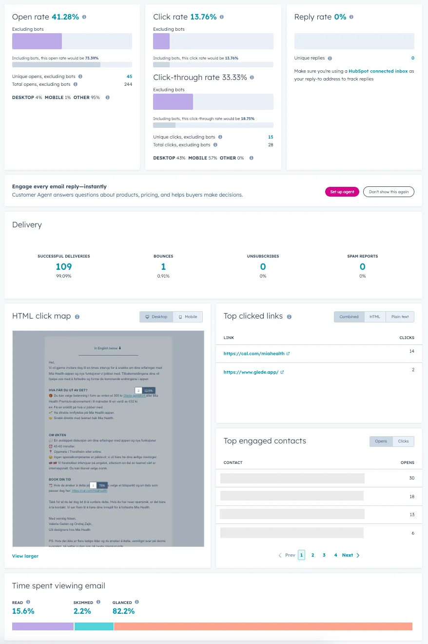 I started sending out invites from Outlook but soon realised some of my emails were getting blocked when sending to 100 contacts. Even with those who received it, the response rate was initially quite low. I had no visibility into what could be wrong: whether recipients didn't find the title relevant, or opened it but didn't find it interesting. Fortunately we were already using HubSpot at Mia, so I was able to utilise the platform for sending the invites.