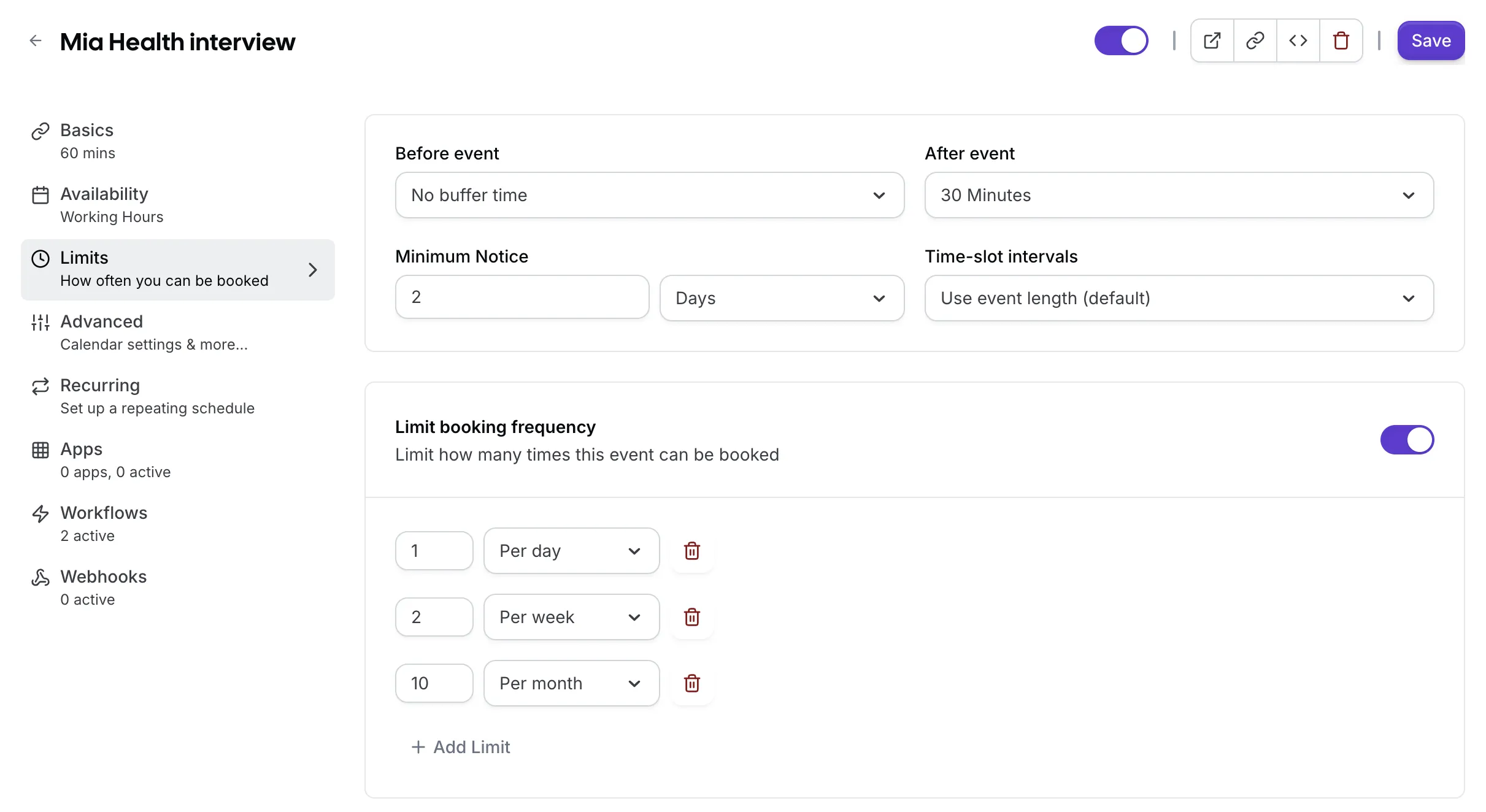 Cal.com: an easy way to schedule a fixed number of interviews per week automatically