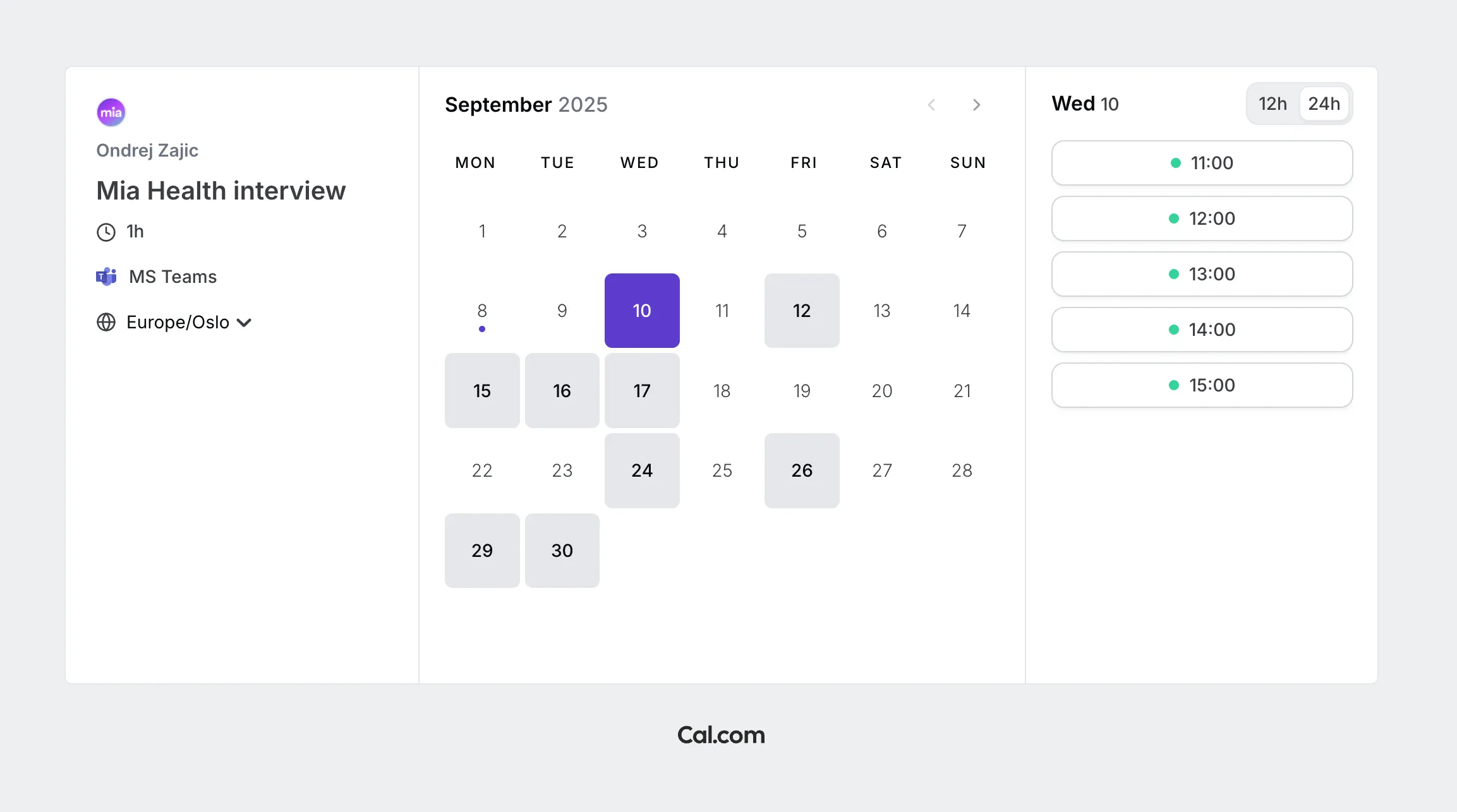 Most scheduling apps were not very customisable, which meant you couldn't plan a full month of equally spread interviews. Cal.com turned out to be exactly what we needed: it offered precisely that and saved a lot of time. If we didn't need a screening form, we got scheduled interviews in our calendar right after sending out the invitation email, without lifting a finger.